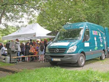 So präsentiert sich der extralange und mit Stehhöhe ausgestattete Transporter in Aquagrün – passend zu den Regentropfen, die das Fahrzeug kurz nach der Vorstellung tauften. „Wir wissen bereits heute, dass er seinen Praxistest gut bestanden hat. Er hat sechs Wochen Sommerferien mit Fahrten im gesamten Stadtgebiet überstanden. Und die Kinder haben ihn sehr intensiv genutzt“, erklärte Waldästl, während die Kinder im Niederpleis Wohnpark das Fahrzeug inspizierten. Allerlei Farben, Papiere, Klebstoff, ausfaltbare Pavillons und Spielgeräte befinden sich in seinem Inneren, aber auch Platz für weitere Ausstattung. Diese soll „August III.“ in seiner Winterpause nach dem zweiten Kinder- und Jugendflohmarkt im Herbst erhalten, kündigte Kernenbach an: „Dann wird er gereinigt und anschließend in sein geheimes, gut gesichertes neues Domizil gebracht.“